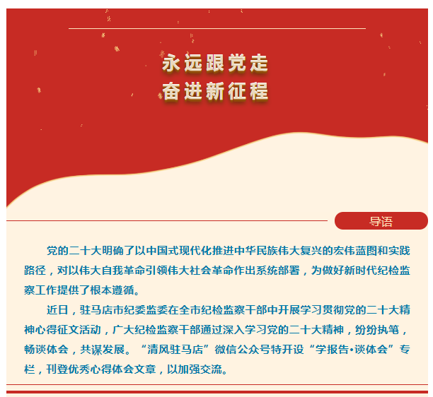 “当代中国青年生逢其时,施展才干的舞台无比广阔,实现梦想的前景无比光明。”习近平总书记在党的二十大报告中鼓励青年干部要砥砺前行不负韶华。作为纪检监察队伍中的青年干部,阔步走在新征程,要始终坚持以习近平新时代中国特色社会主义思想为指导,依靠科学理论指导实践,赢得优势、赢得主动、赢得未来,切实把学习党的二十大报告精神转化为践悟使命担当的“纪检力量”。