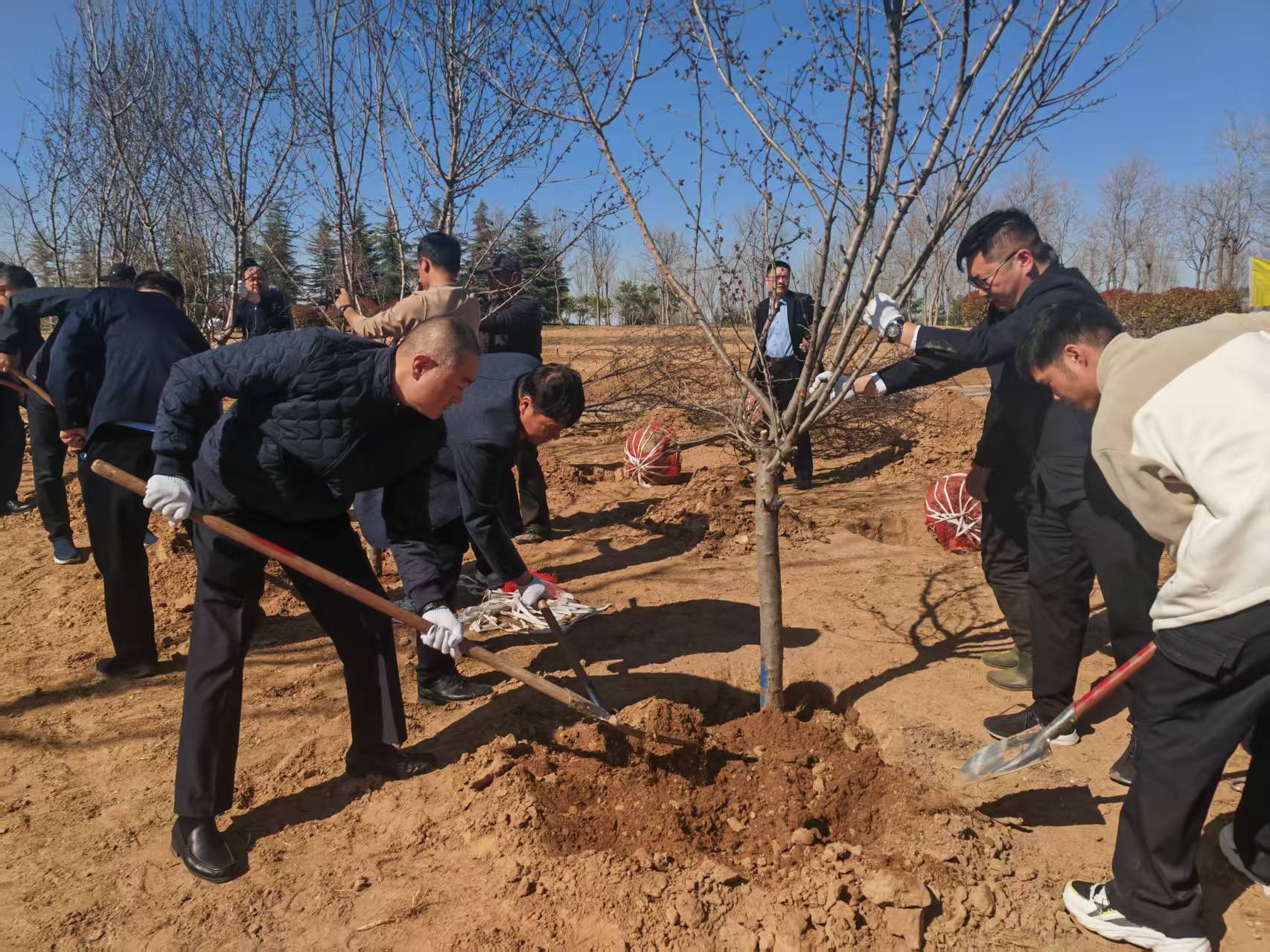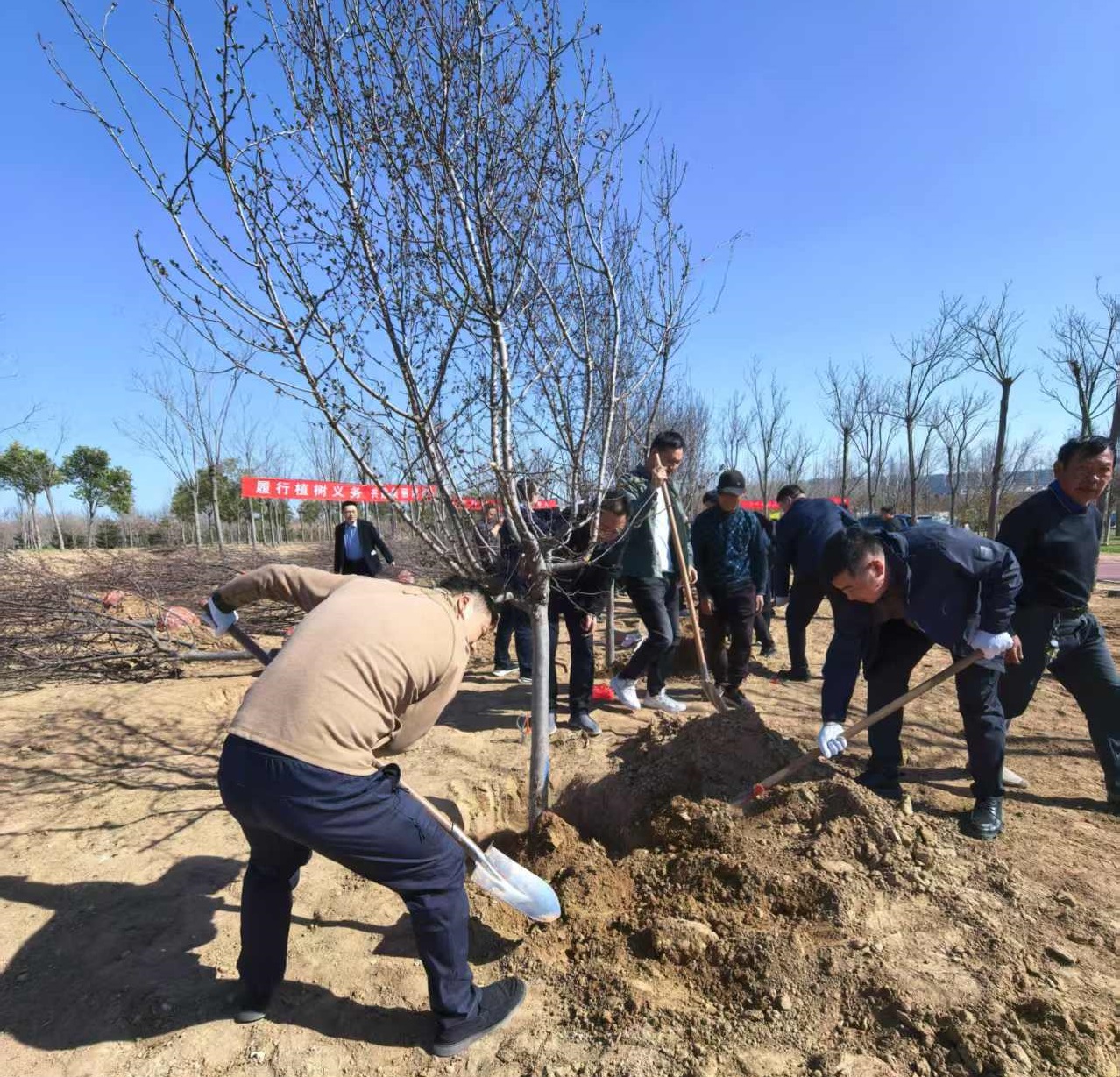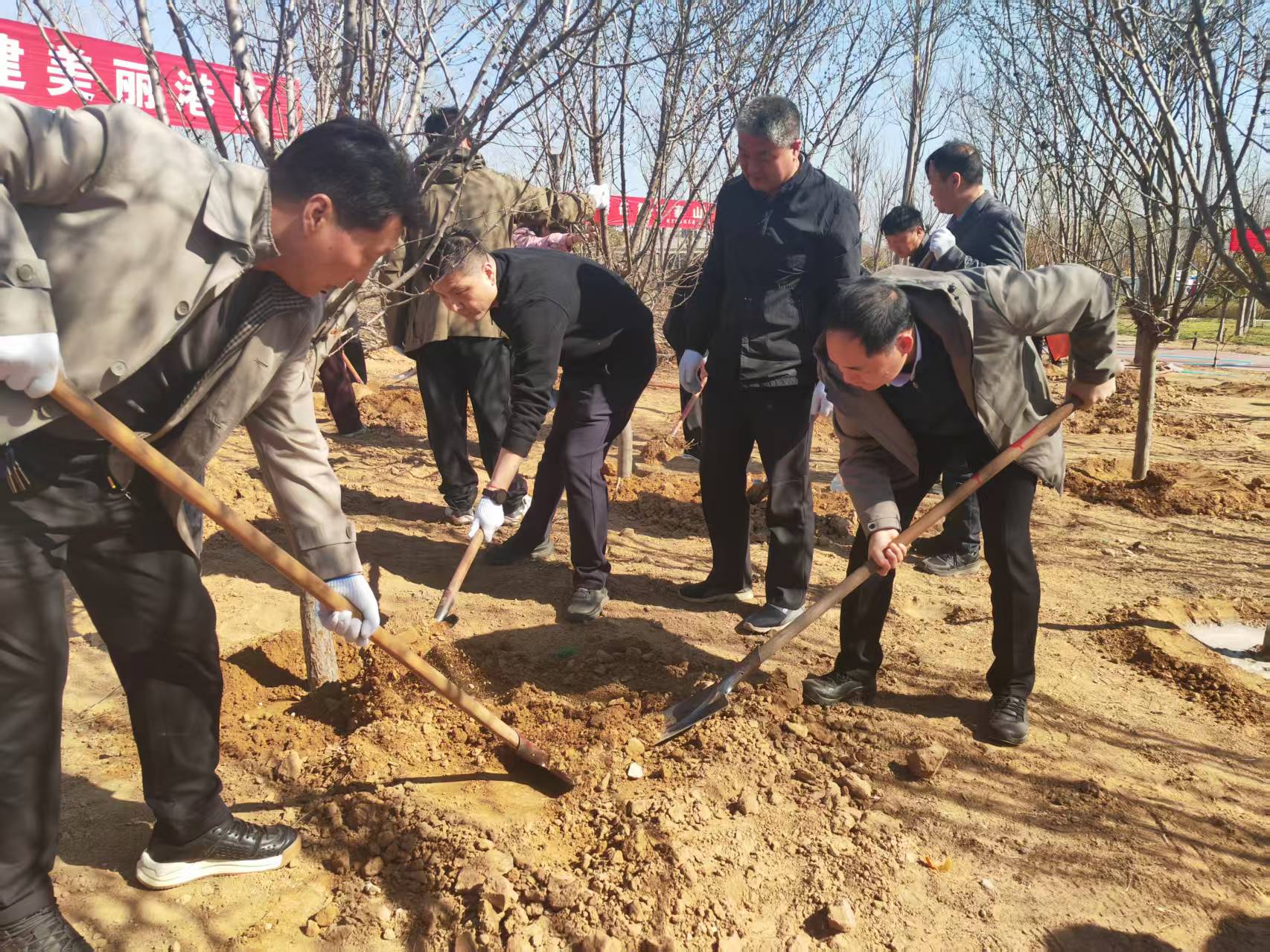 植树现场,纪检监察干部们精神抖擞、干劲十足,大家分工协作、互相配合,经过辛勤奋战,一棵棵新栽下的海棠树苗迎风挺立、错落有致,在春日里摇曳生姿。