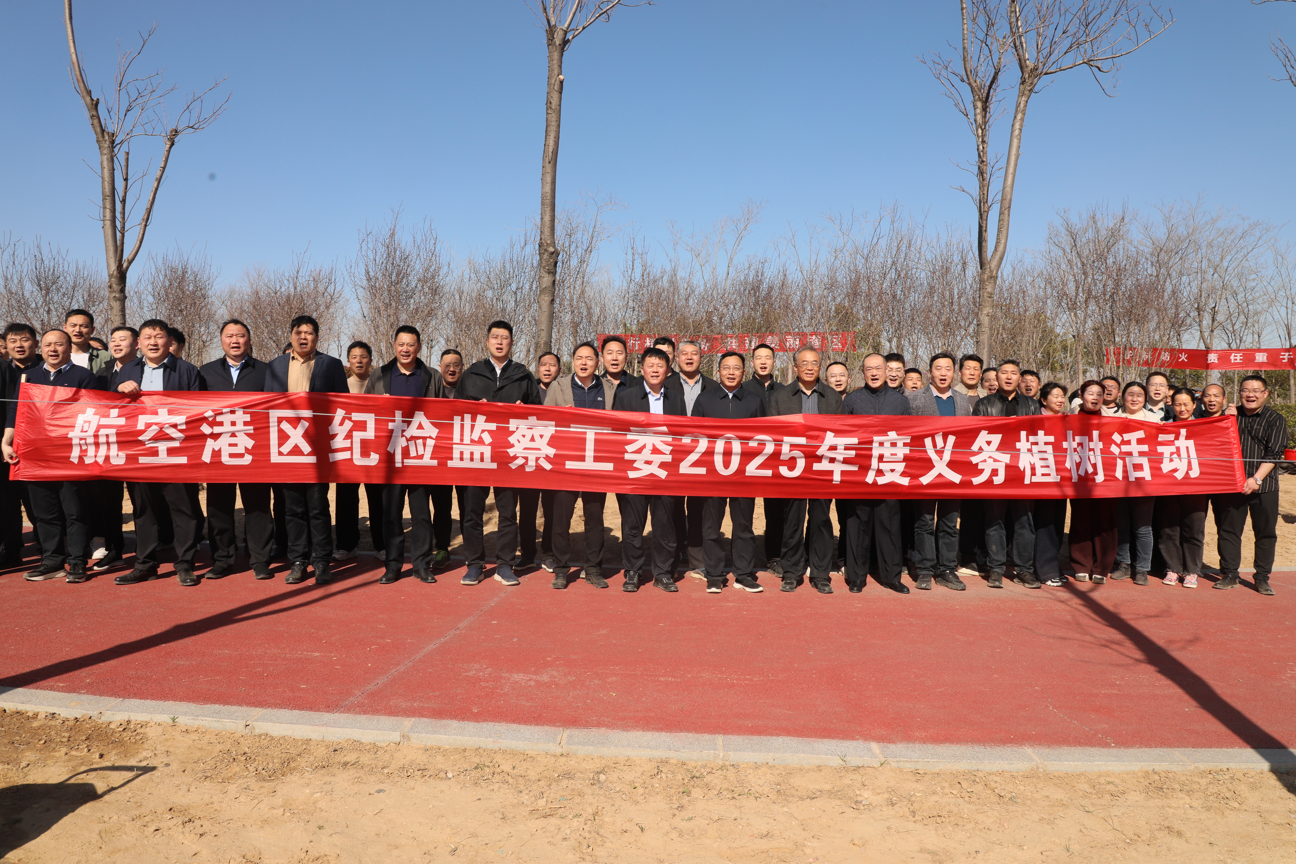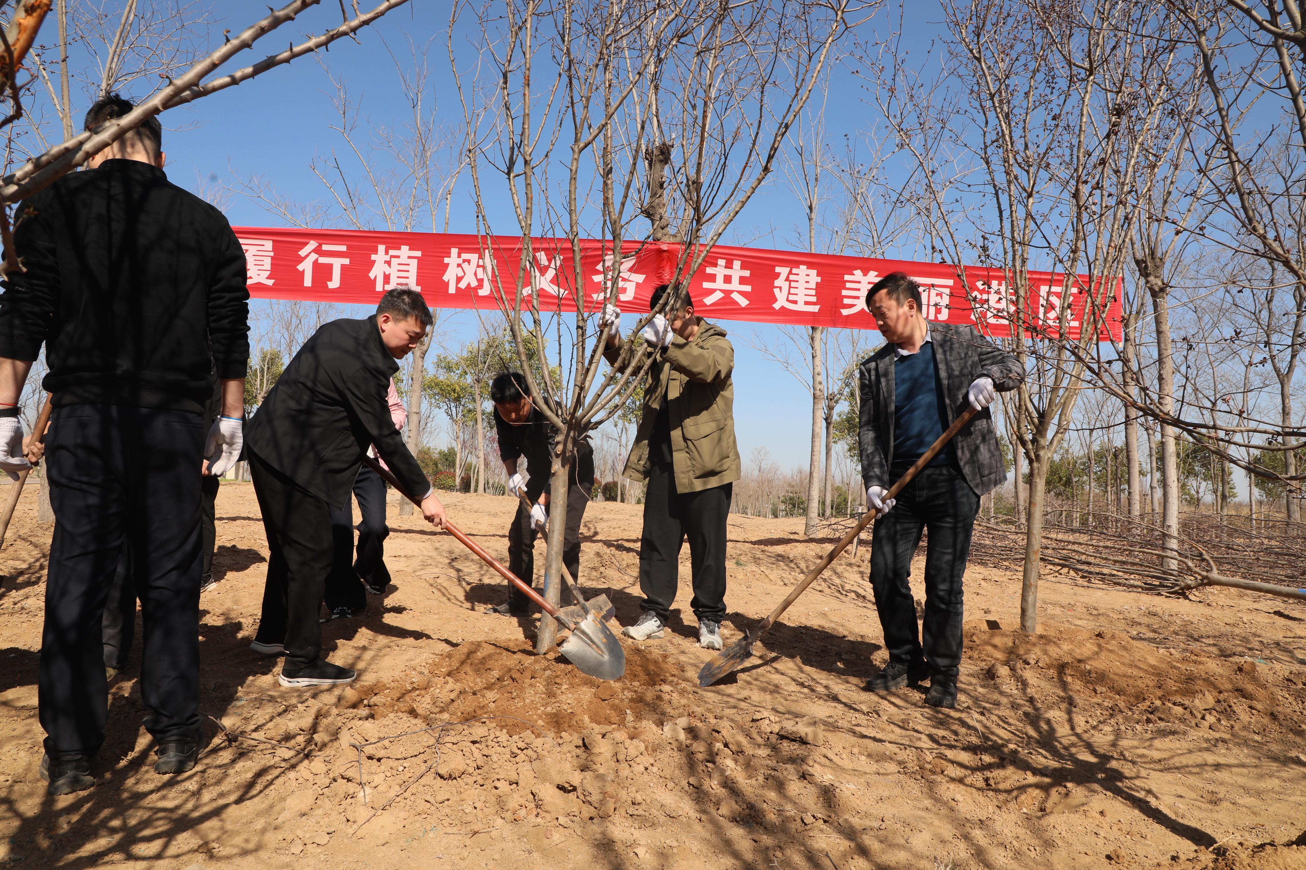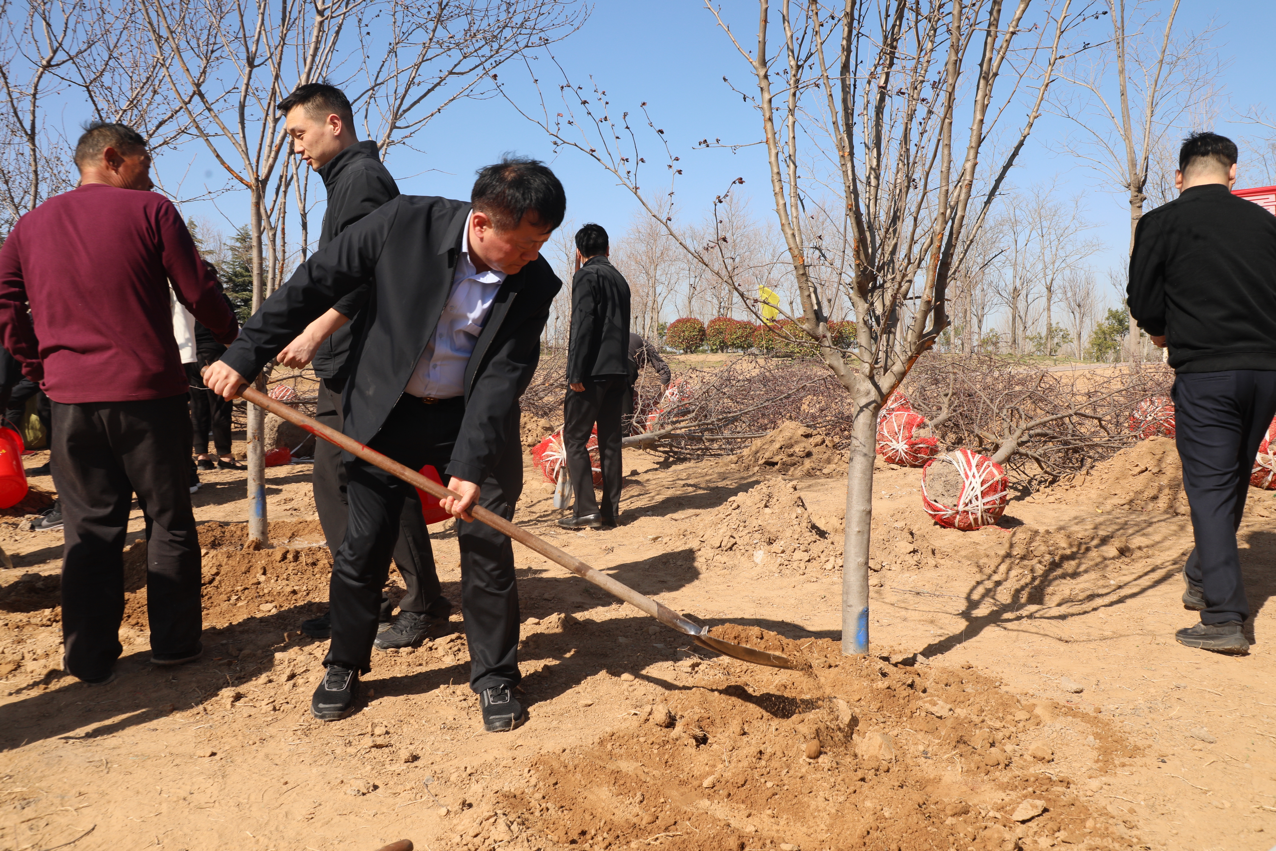 植树现场,纪检监察干部们精神抖擞、干劲十足,大家分工协作、互相配合,经过辛勤奋战,一棵棵新栽下的海棠树苗迎风挺立、错落有致,在春日里摇曳生姿。
