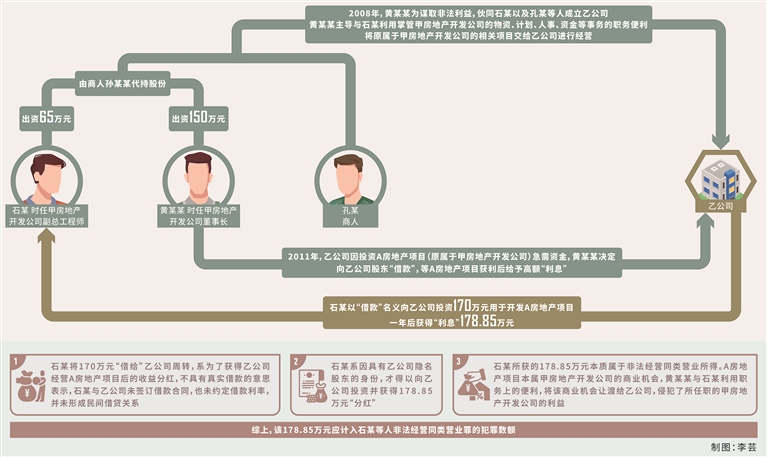 非法经营同类营业罪。2008年初,时任甲房地产开发公司董事长黄某某(系国家工作人员,另案处理)为谋取非法利益,伙同石某以及商人孔某等人(另案处理)商议成立乙公司开展房地产开发和销售业务。2008年5月,乙公司成立,其中黄某某出资150万元、石某出资65万元,为逃避查处,二人决定由孙某某代持股份。2008年至2018年,黄某某主导与石某利用掌管甲房地产开发公司的物资、计划、人事、资金等事务的职务便利,将原属于甲房地产开发公司的相关项目交给乙公司经营。黄某某主导经营相关项目以及分配经营利润。2011年,乙公司因投资A房地产项目(原属于甲房地产开发公司)急需资金,黄某某决定向乙公司股东“借款”(实为融资),等A房地产项目获利后给予高额“利息”(实为“分红”)。石某以“借款”名义向乙公司投资170万元用于开发A房地产项目,一年后获得“利息”178.85万元。经查,石某通过非法经营共计获利197.2万元(除去上述178.85万元,其余部分为石某投资65万元获得的“分红”)。