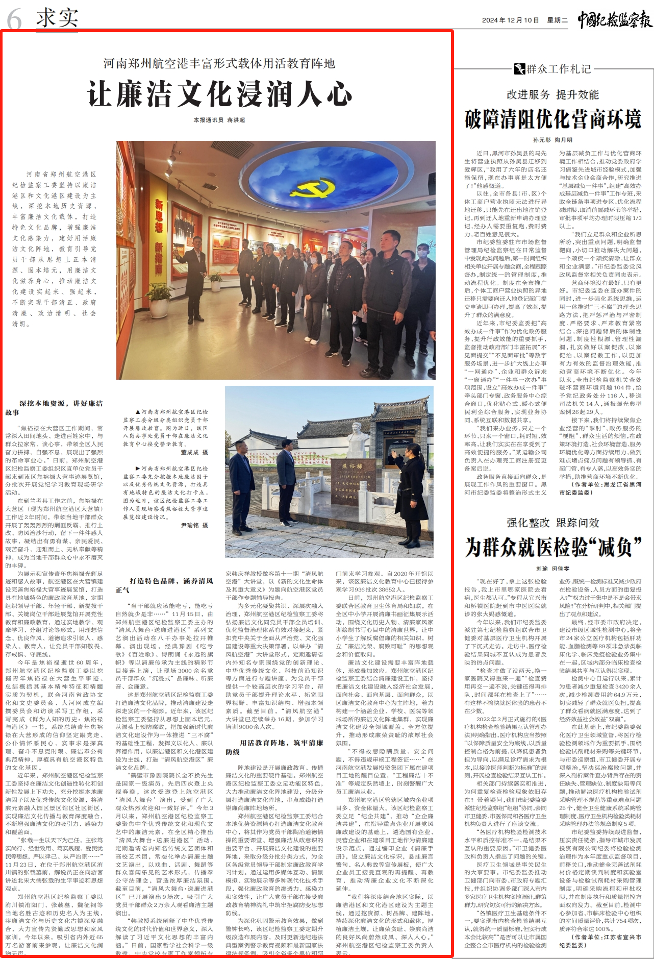 12月10日,中国纪检监察报专版刊发《河南郑州航空港丰富形式载体用活教育阵地 让廉洁文化浸润人心》,报道航空港区纪检监察工委坚持以廉洁港区和文化港区建设为主线,深挖本地资源、打造特色品牌、用活廉洁文化阵地,推动廉洁文化建设实起来、强起来的生动实践。